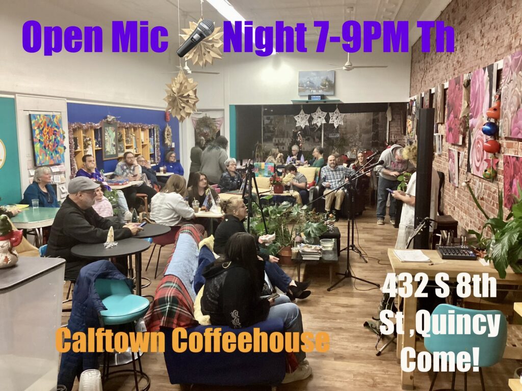 It is free to attend and participate. Kitchen opens at 6PM for purchase of coffee drinks, lotus drinks, sandwiches, quesadillas and pastries. All freshly made to order. Come early, visit with friends and family and enjoy this big city feel event, right here in Quincy.